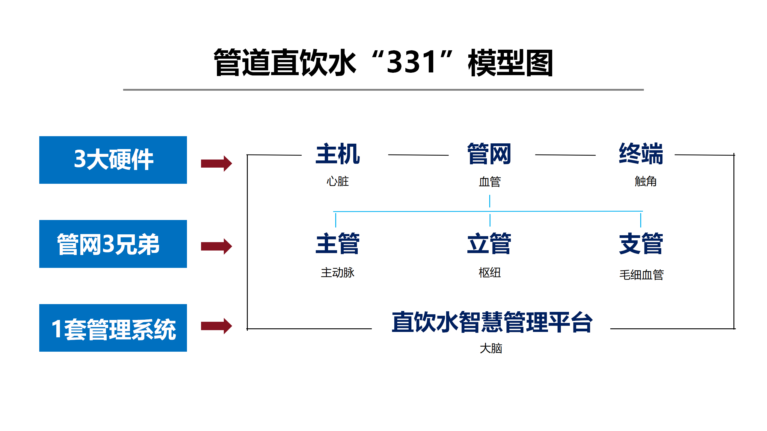 为了帮助大家更清晰地理解和分析管道直饮水,我提炼了一个“331”模型-3大硬件+管网3兄弟+1套管理系统。