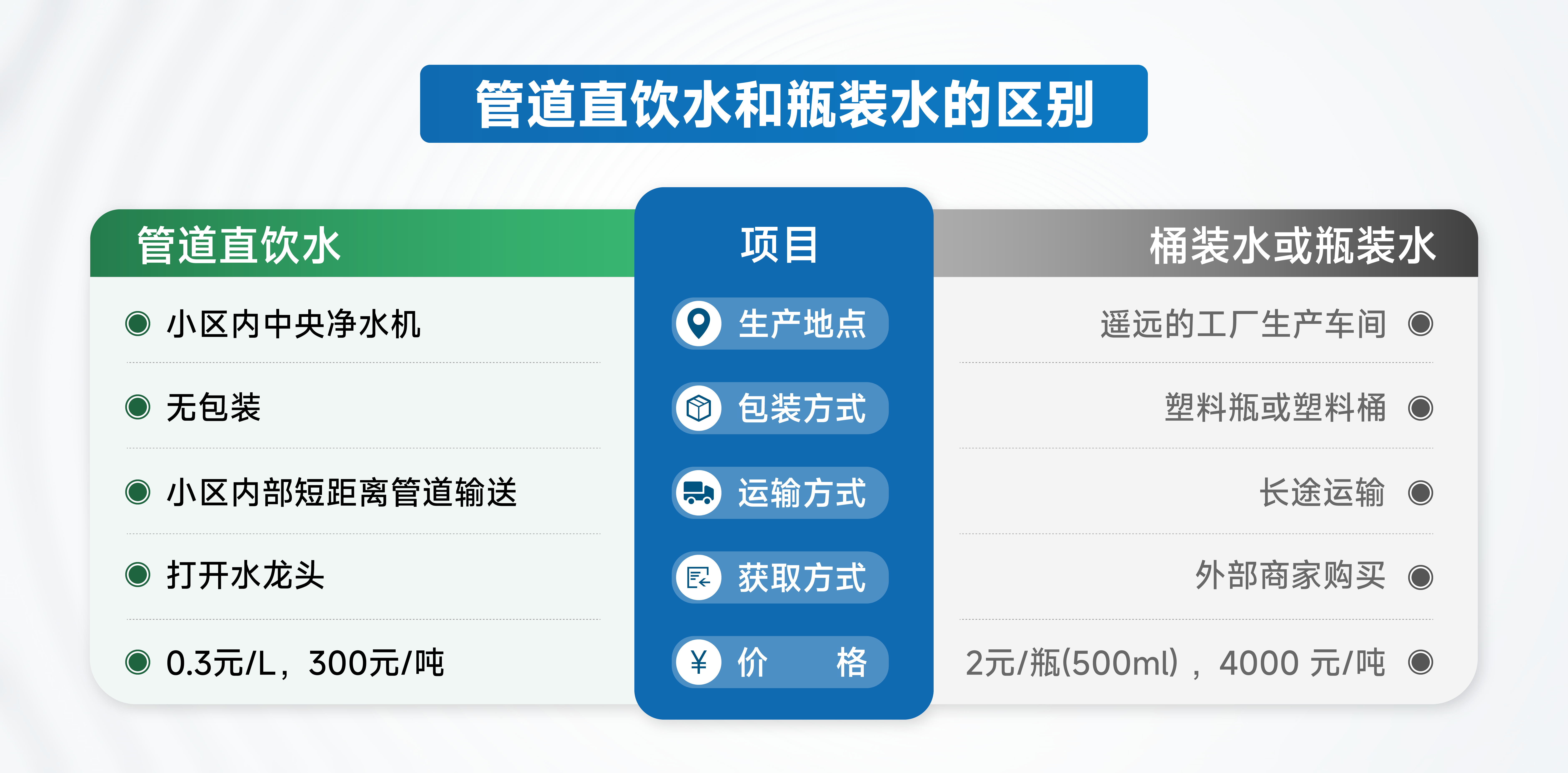 相比瓶装水而言,管道直饮水的优势非常明显。